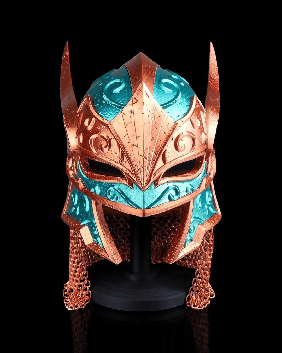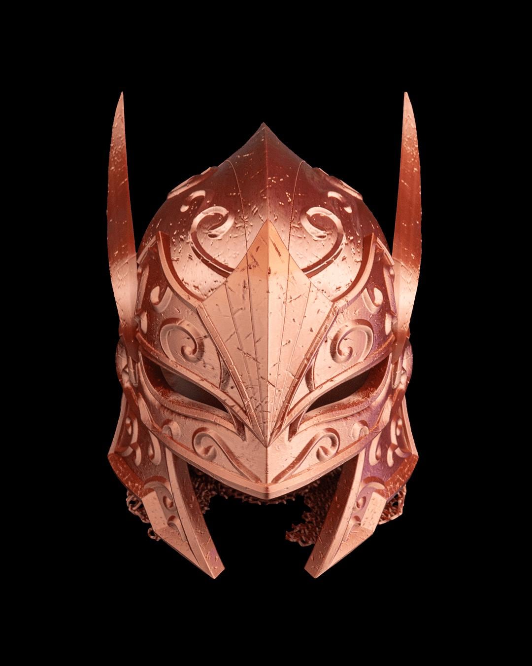 An elf-style helmet with gentle curves and subtle leaf patterns. Balanced, neat, and iconic.